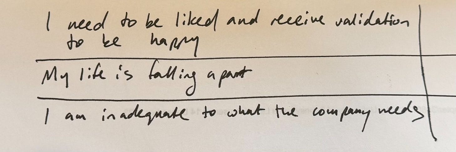 For example, this is what the A-B-C model looks like for one of the thoughts I wrote down in my journal pictured above: I am inadequate to what the company needs: